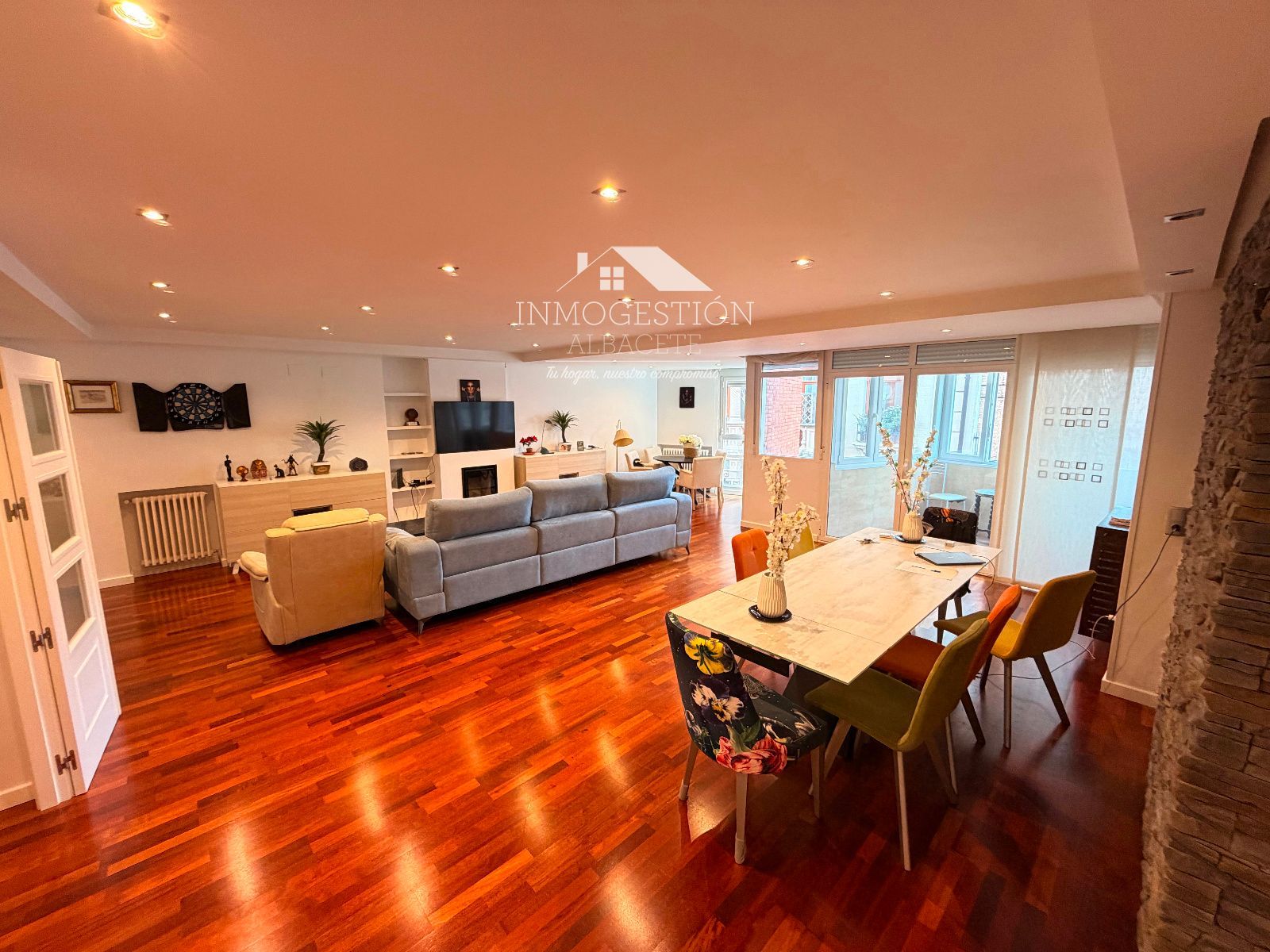 El auténtico protagonista de la vivienda es su impresionante salón de aproximadamente 60 m², un espacio amplio, elegante y representativo que incorpora chimenea y proyector, ideal tanto para reuniones sociales como para disfrutar de un auténtico cine en casa. Desde el salón se accede a una terraza acristalada, que amplía la sensación de espacio y permite disfrutar de luz natural durante todo el año, convirtiéndose en una zona perfecta como rincón de lectura o zona de relax. La amplitud, la luminosidad y los detalles convierten esta estancia en una pieza única dentro del mercado inmobiliario de la ciudad.