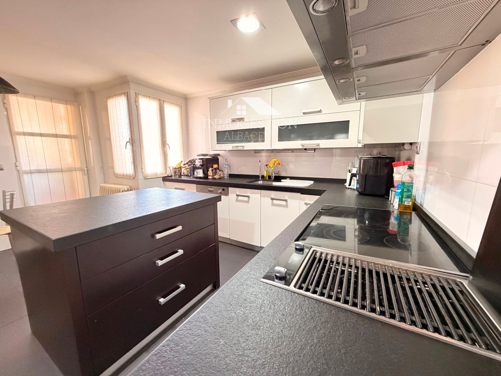 La cocina de diseño destaca por su funcionalidad y estilo, equipada con isla central y parrilla, pensada para quienes valoran la gastronomía y los espacios modernos donde cocinar y compartir.